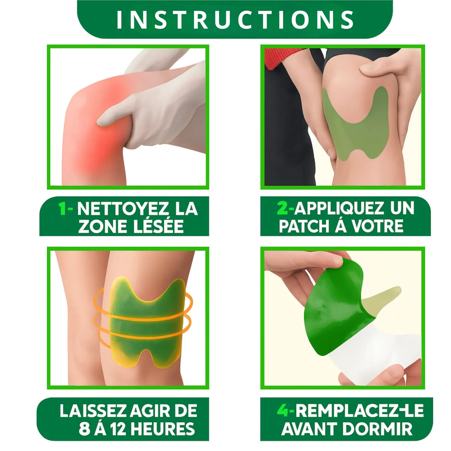 Il suffit de nettoyer la zone, retirer le film protecteur et appliquer fermement sur le genou douloureux.